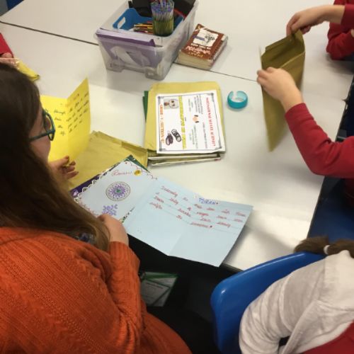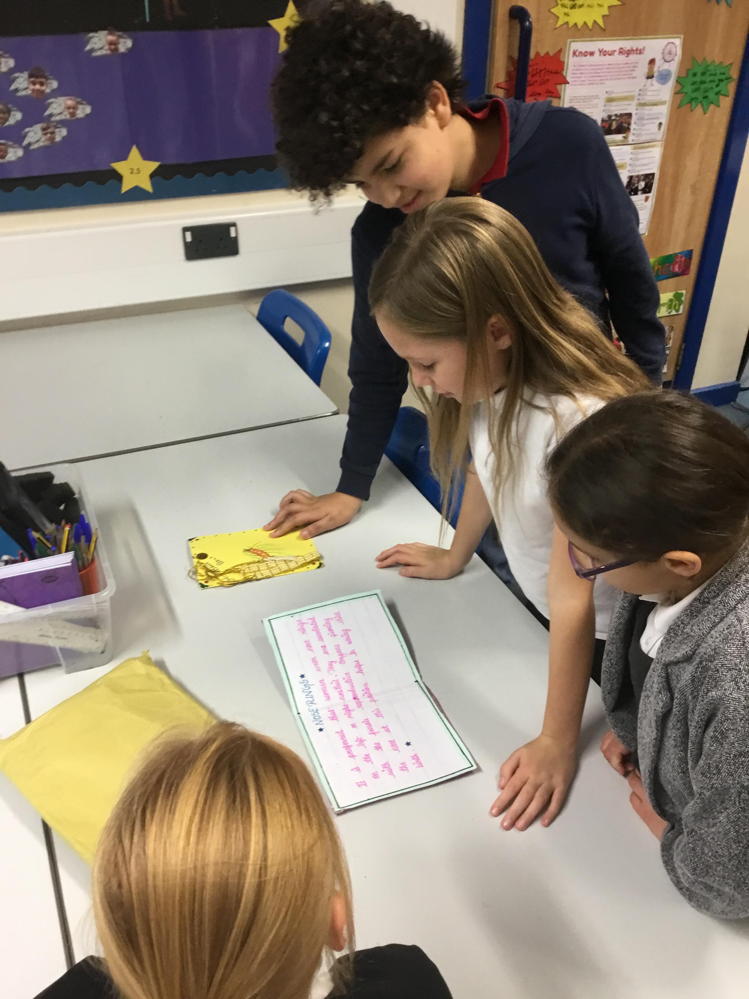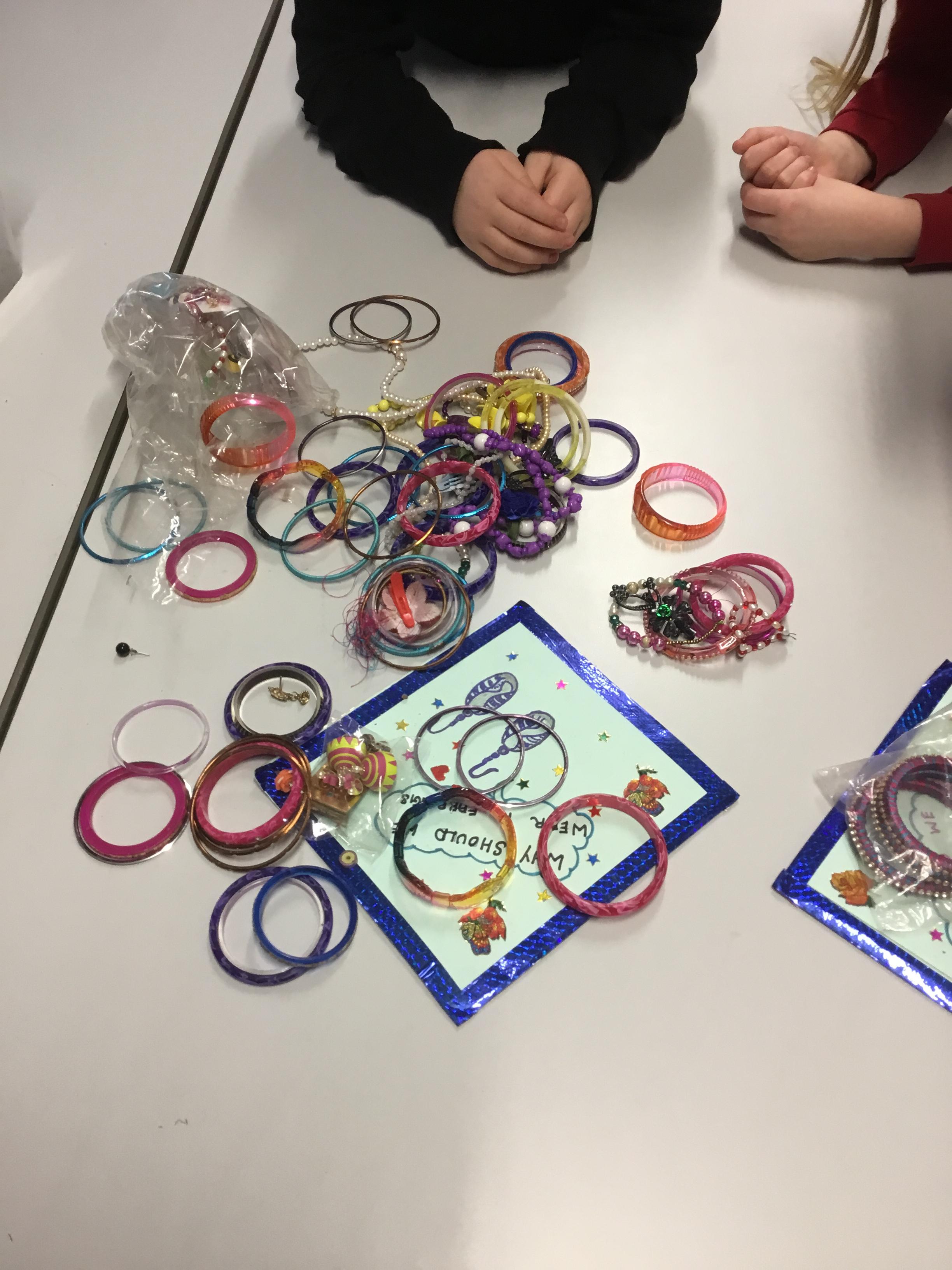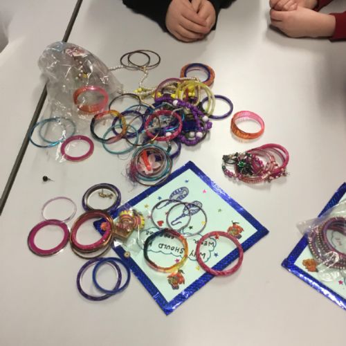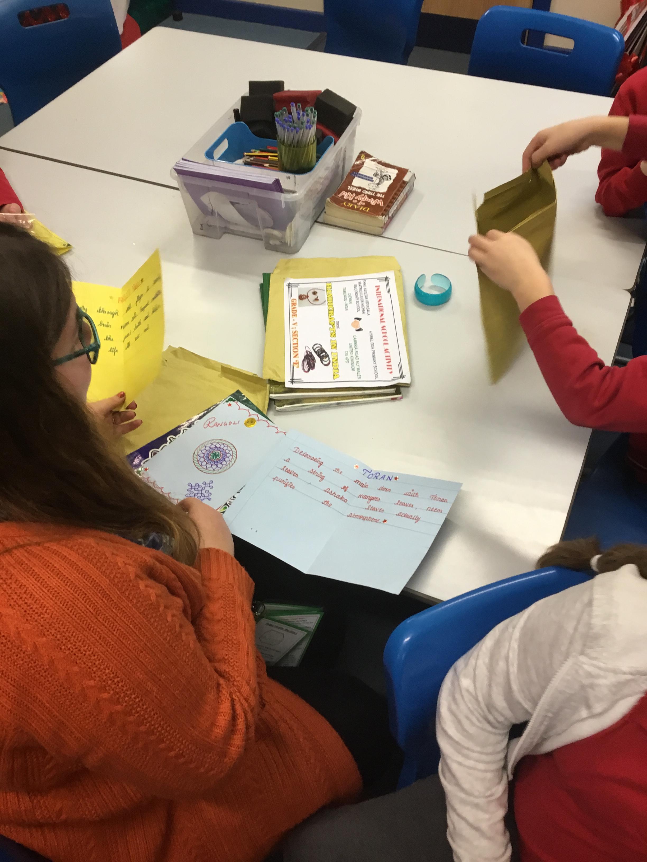 The school that we are paired with in India sent us a box full of information and work books to look at and learn about their culture. Foreign Office spent some time reading the materials that they had sent and looking at all the beautiful objects. The jewellery was definitely a highlight. Included in the box were lots of booklets that the children had put together talking about their beliefs, culture and art. The booklets also had information about how different jewellery is worn in India for health reasons. Foreign Office enjoyed looking at how different this was from their own culture.